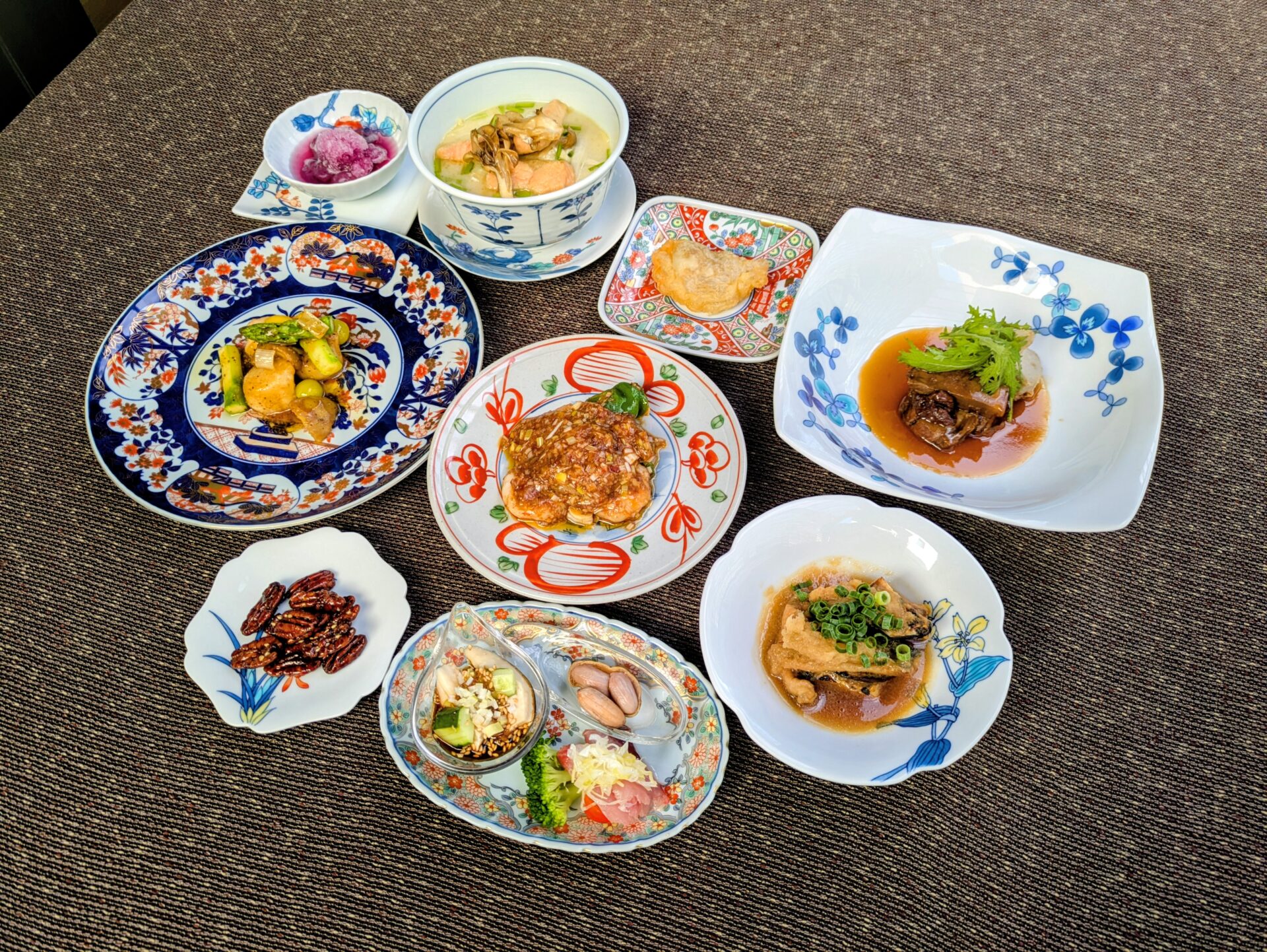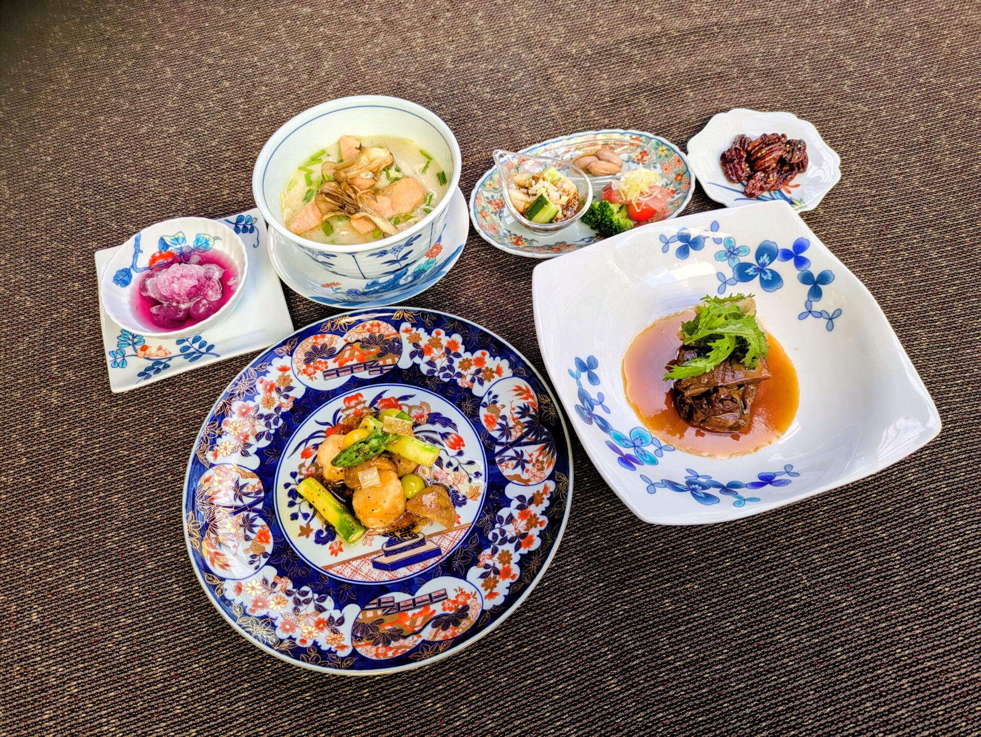 海老のチリソース煮伊万里コースバージョン 秋刀魚と焼き茄子の蕪おろしソース 牛舌の干し梅と紹興酒煮込み 秋鮭と茸の豆乳湯麺 デザート